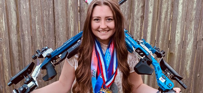 Competitions have taken her and her family all over the country, including Ohio, Colorado Springs, Alabama and Atlanta. Mikole’s most recent and greatest success took her to the Civilian Marksmanship Program’s Nationals Tournament in Anniston, Alabama in July 2021. In the Co-Ed Junior Olympic Division of National 3PAR (three-position air rifle) match, Mikole earned the ranking of #1 in the nation with a score of 599 out a possible 600, receiving the gold medal as Junior Olympic 3PAR Champion. She broke two national records at this competition for both overall score and her standing score of 199 (out of a possible 200). The Houston Hot Shots finished second in the team competition.