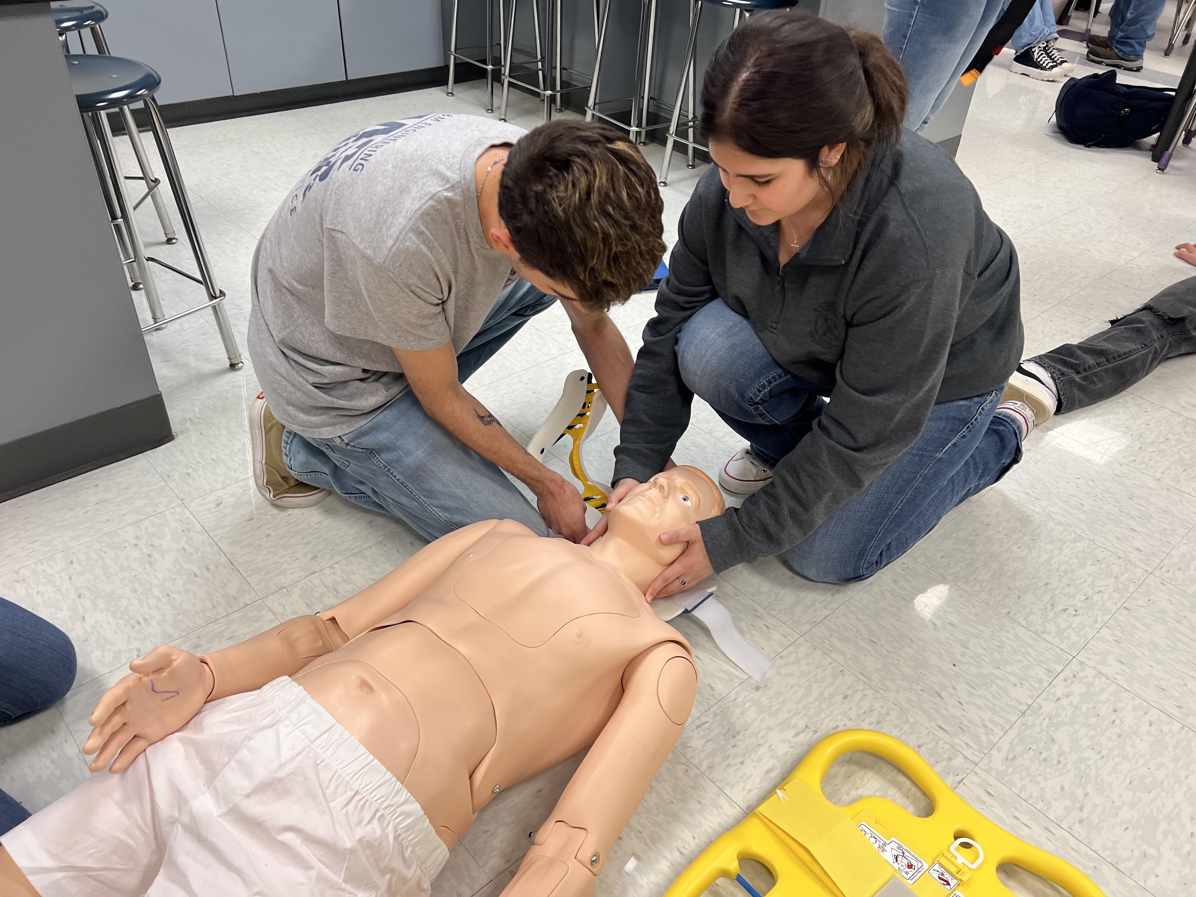 Students in this practicum level class are required to earn 72 hours of skills training with an EMS crew and 40 hours in an emergency room. Because the shifts held in these careers range between eight and twelve hours, these students are required to get these hours outside of the school day, often on weekends and school holidays. Many of these students also have jobs of their own and some even participate in extracurricular activities including track, band and basketball.