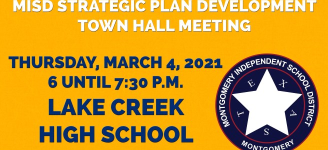 On Thursday, March 4, Montgomery ISD will host a second Strategic Plan Town Hall meeting from 6 p.m. to 7:30 p.m. at Lake Creek High School.
